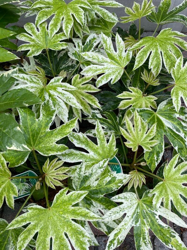 De goed winterharde plant heeft groene bladeren met witte vlekken.